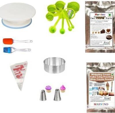 Marvino Combo Set of Cake Making: Cake Turntable, Round Shape Cake Mould, 8 pcs Measuring cups & Spoon, Silicon Brush & Spatulla, Icining Bag With 2 Icining Nozzels, 250 Gm Chocolate Premix & 100 Gm Chocolate Whipped Cream Powder Kitchen Tool Set
